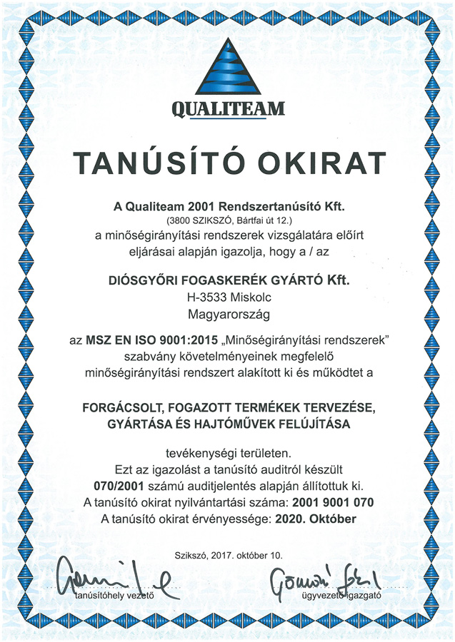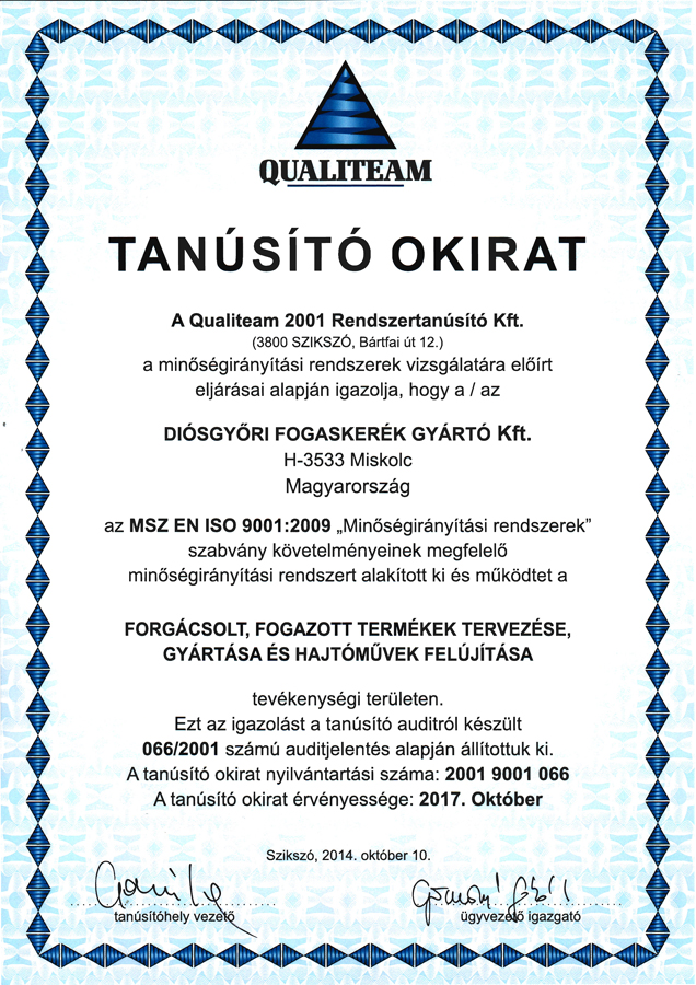 Ennek alapján határozzuk meg minőségirányítási céljainkat, korszerűsítjük minőségirányítási rendszerünket, melyet az MSZ EN ISO 9001:2001 szabvány fejlődésével összhangban folyamatosan továbbfejlesztünk.